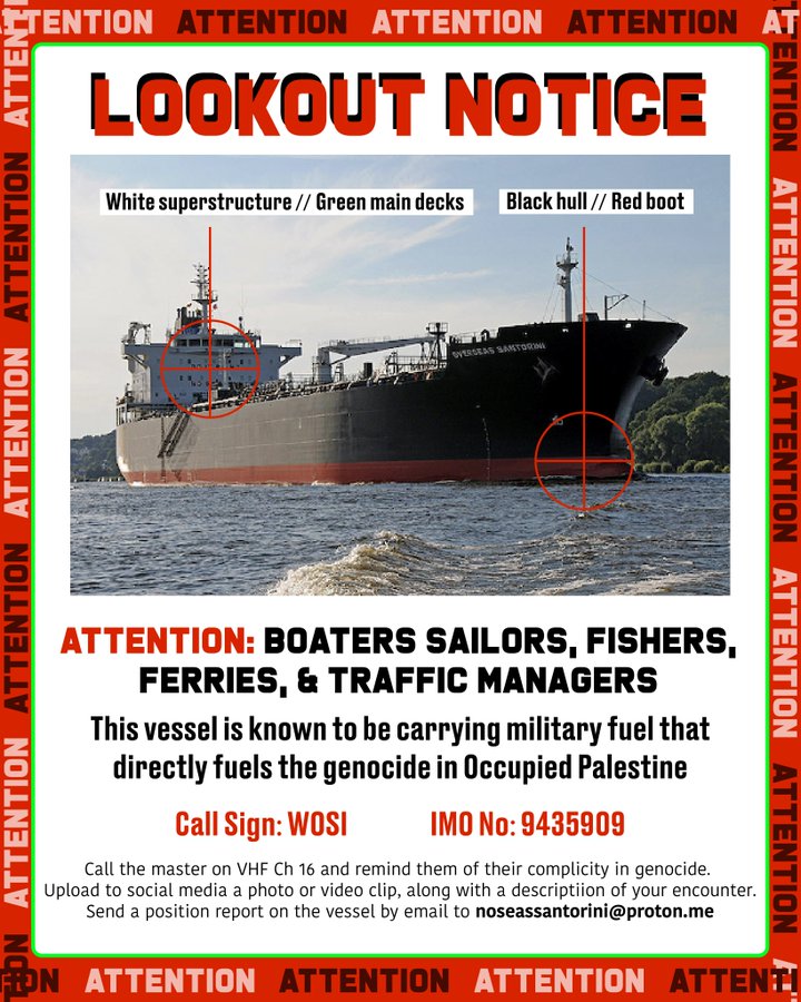 The Overseas Santorini is one of two ships that have continued to supply military fuel to Israel during the genocide. It is the source of fuel for every bomb dropped on Gaza.
