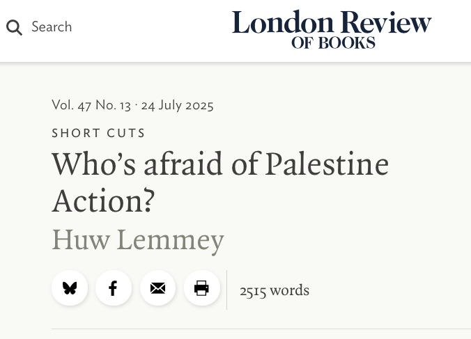 The London Review of Books publishes an article that its author admits – after the government’s recent proscription of Palestine Action – “could be considered a criminal act and a terrorist document”.