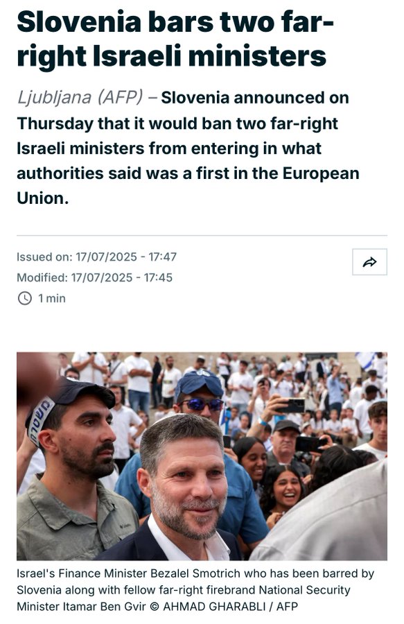 Slovenia is the first European Union country to ban Israeli ministers Itamar Ben-Gvir and Bezalel Smotrich from entering the country.