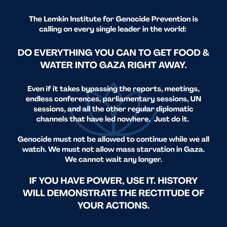 The @LemkinInstitute is calling on every leader in the world to step in immediately with measures that ensure food and water gets into Gaza right now.