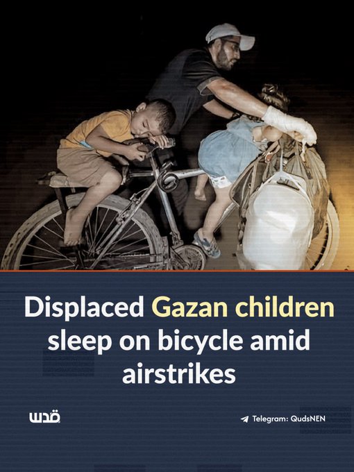 Two Palestinian children fell asleep on a worn-out bicycle as their injured father pushed them through Gaza’s darkened streets, searching for safety amid relentless Israeli airstrikes, weighed down by hunger, fear, and repeated forced displacement.