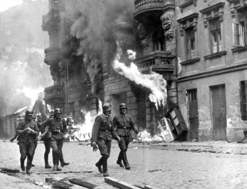 the mass eradication of an entire neighborhood to drive civilians out towards slaughter is very similar to what happened In Warsaw in 1943, April, May 1943, the final liquidation of the Warsaw Ghetto, where SS troops, backed by their Nazi auxiliaries, went in to finish off the remaining 70,000 to 80,000 Jews who live in a
