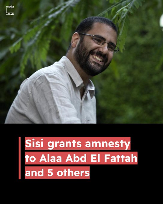 President Abdel Fattah al-Sisi has granted amnesty to activist Alaa Abd El Fattah and five others, in response to calls by the National Human Rights Council, state-aligned television announced on Monday.