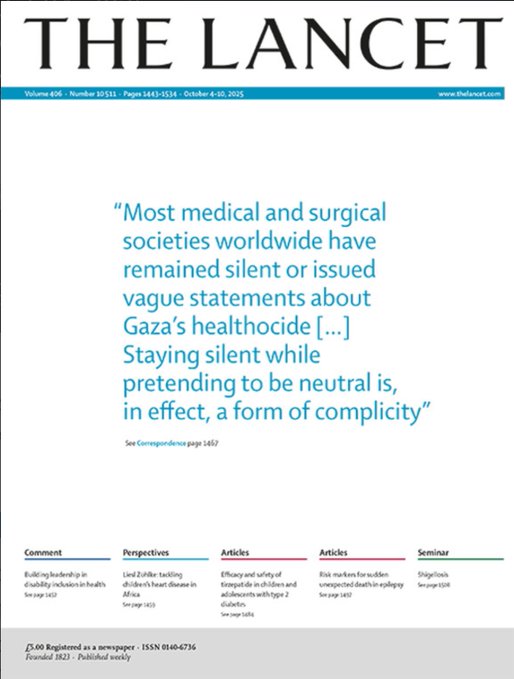 Silence is complicity.” This month, @TheLancet one of the world’s leading and most influential medical journals features Gaza on its cover, highlighting the ongoing health genocide committed by the Israeli army against civilians.