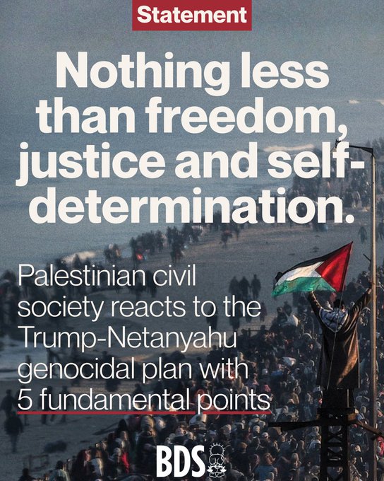 Occupied Palestine, 9 October 2025 – In response to the so-called Trump Plan, a scheme primarily designed by Israel’s fascist government to save it from its unprecedented global isolation, in the midst of the ongoing, livestreamed US-Israeli genocide against millions of Palestinians in Gaza, and recognizing the diversity of political positions among Palestinian parties, the Palestinian popular and civil society consensus on the following 5 fundamental points remains solid: