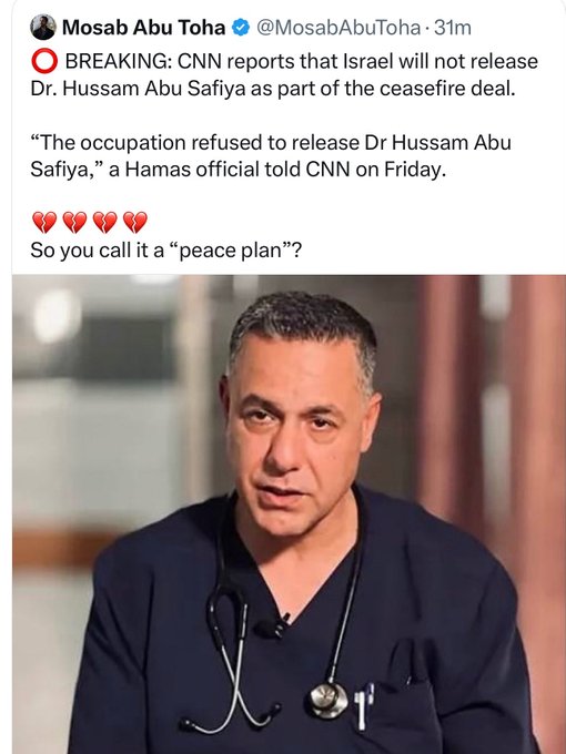 CNN reports that Israel has refused to release two abducted Palestinian doctors, renowned pediatrician Dr. Hussam Abu Safiya and Dr. Marwan Al Hams, deliberately excluding them from the ceasefire and prisoner swap agreement.