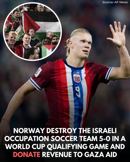 FIFA is too cowardly to kick the occupation state from all competitions so countries are making sure they don’t advance by trashing them. Norway won their match today 5-0 and Norway’s soccer federation says it “cannot remain indifferent” to humanitarian suffering in Gaza and will donate all profits from this World Cup qualifying game to aid work in Gaza.