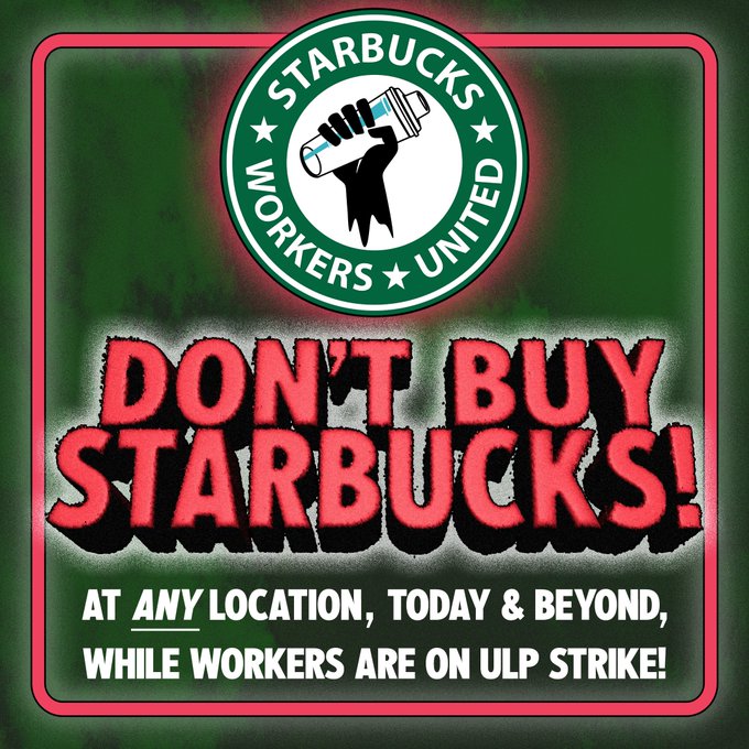 As of today, Starbucks workers across the country are officially ON STRIKE. And we’re prepared for this to become the biggest and longest ULP strike in Starbucks history. Say #NoContractNoCoffee with us: DON’T BUY STARBUCKS for the duration of our open-ended ULP strike! $SBUX