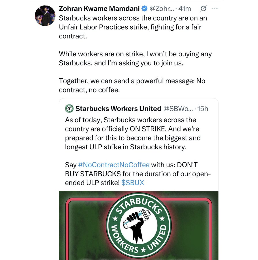Zohran was just elected Mayor and just made a video asking for donations to Starbucks workers @SBWorkersUnited hardship fund