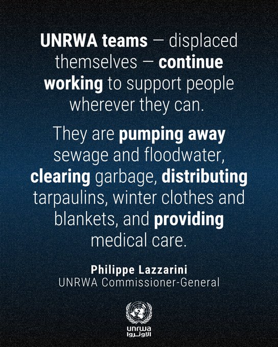UNRWA teams — displaced themselves — continue working to support people wherever they can. They are pumping away sewage and floodwater, clearing garbage, distributing tarpaulins, winter clothes and blankets, and providing medical care.