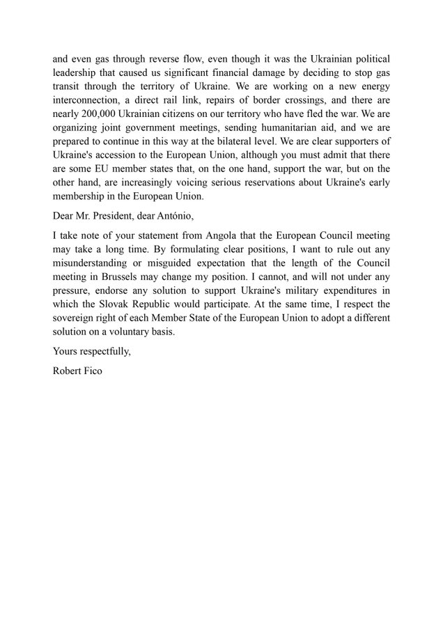 If for Western Europe the life of a Russian or a Ukrainian is worth shit, I do not want to be part of such a Western Europe. I told A. Costa that I will not support anything, even if we have to sit in Brussels until the New Year, which would lead to support for Ukraine’s military expenditures. I am ready, as Prime Minister of the Slovak Republic, to support Ukraine in its reconstruction on the basis of bilateral negotiations between the Slovak and Ukrainian governments, but I reject senseless killing.