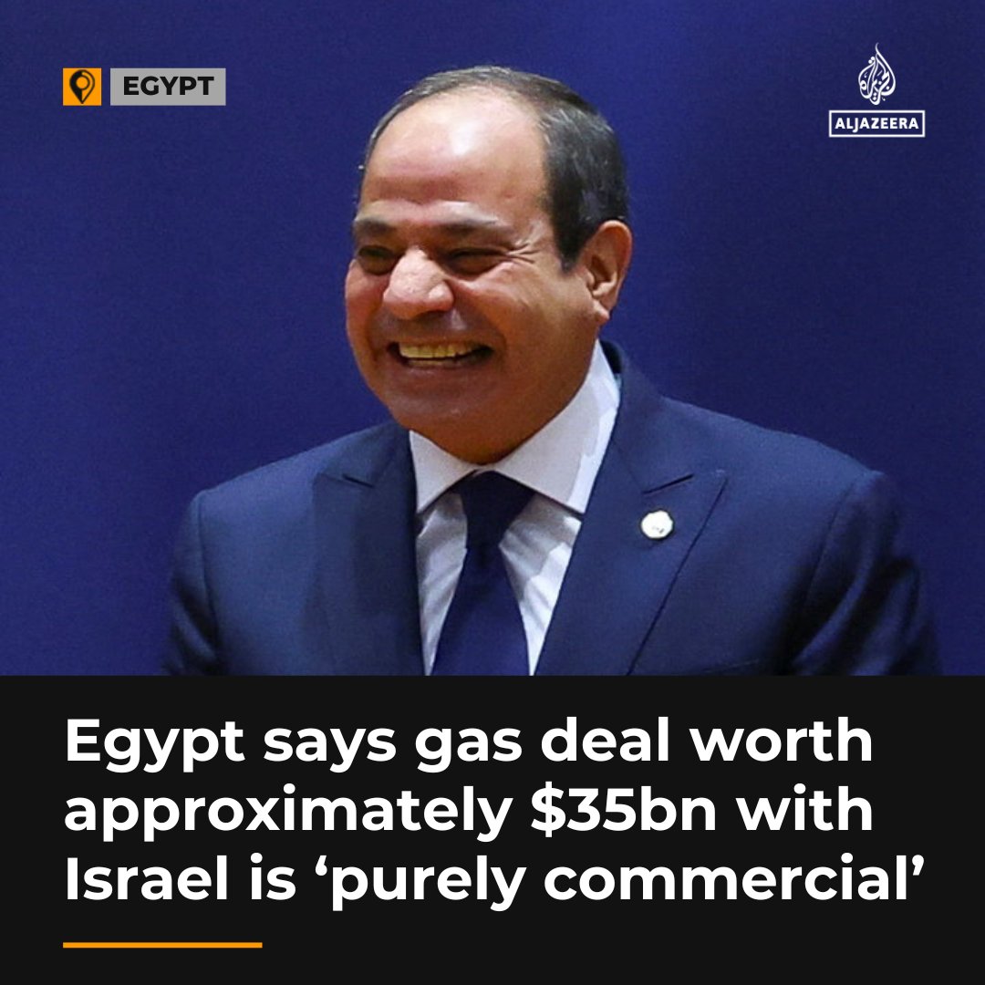 Egypt has said that Cairo’s $35bn natural gas deal with Israel is a “purely commercial” arrangement and that there are no “political dimensions” to the deal. : http://aje.io/yfcui4