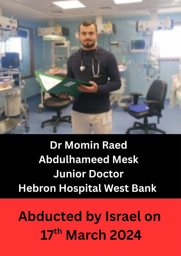 Doctor Momin Raed Mesk was abducted by the Israeli Occupation forces on the 17th March 2024. Do not forget him. Speak up and demand his release.