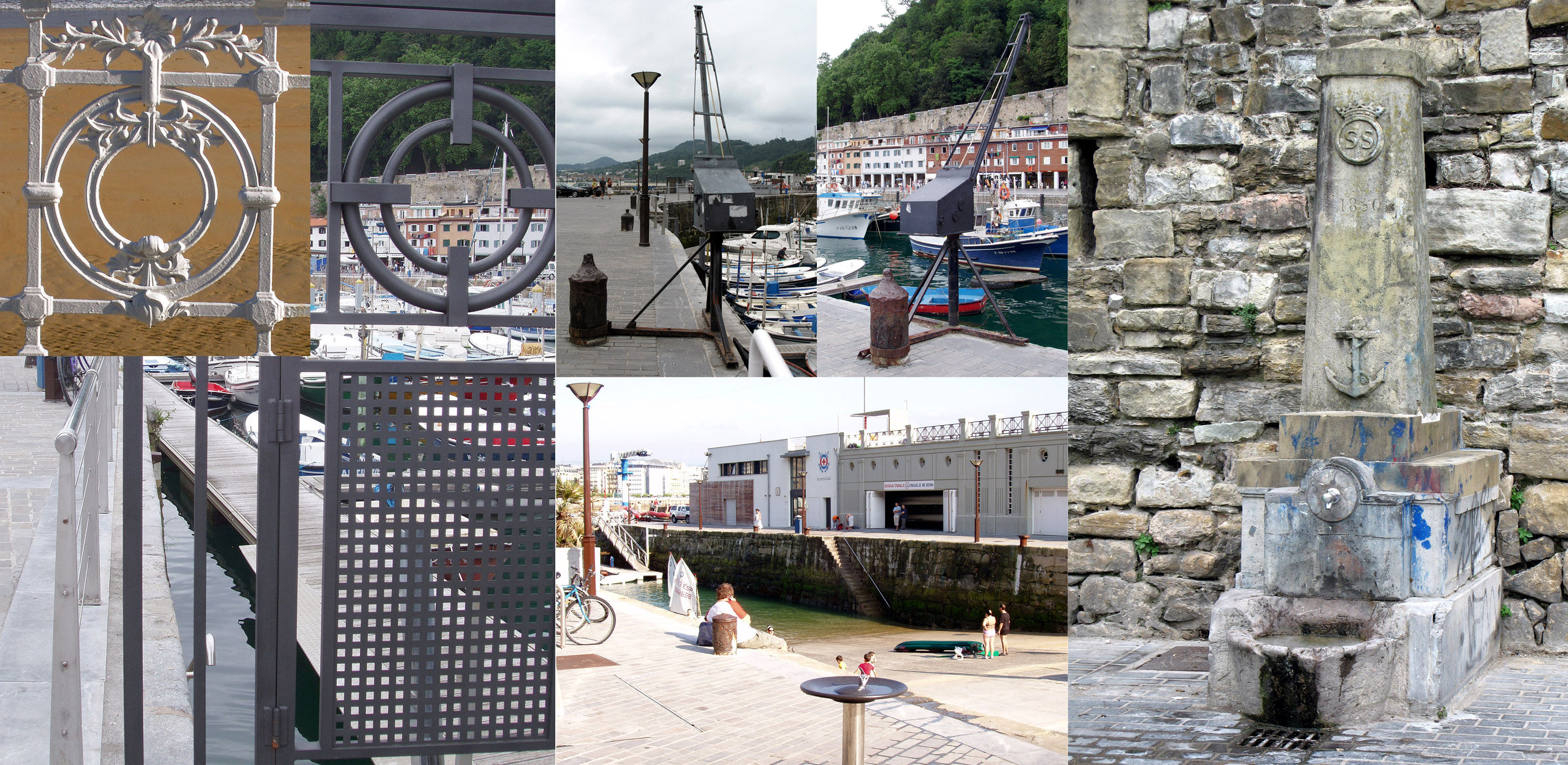 - Portuko altzariak eta arkitekturatxoak, gaurkoak eta atzokoak. Batzuen eta beste batzuen artean garabi txikiak, kanoiak, Kontxakoari keinu ikonografikoa (sinplifikatu baizen sinbolikoa) egiten dion baranda ontziralekuaren sarreran, arraun eskola eta harresi zaharrean txertatzen den iturria nabarmentzen dira.