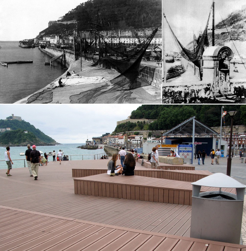 - Portuan besteak beste sareak lehortzeko erabiltzen zen plano inklinatuaren ikuspegi zahar eta berria, espazio horren berreskurapenaren ostean. 1862-1905 urteen bitartean zegoen iturritxoa atzeman daiteke.