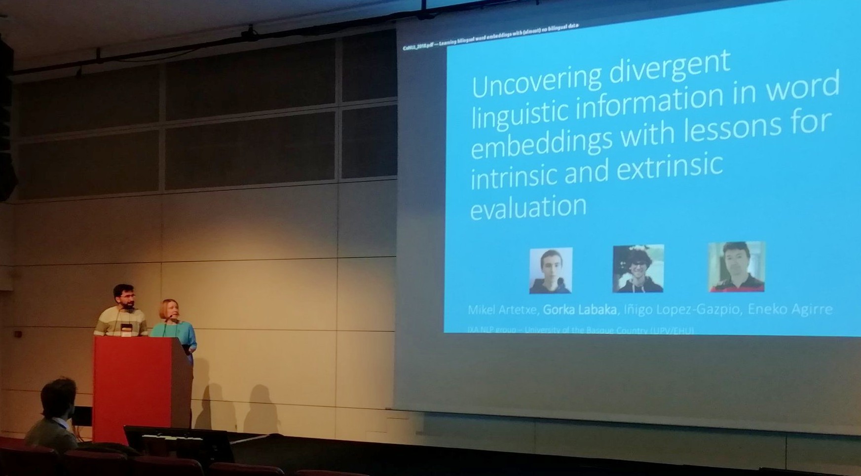 Lehengo astean CoNLL 2018 biltzar zientifikoko artikulu onenaren saria eman zieten Mikel Artetxe, Gorka Labaka, Iñigo Lopez-Gazpio, eta Eneko Agirre ixakideei. “Hizkuntza-ikasketa konputazionala” da CoNLL biltzarreko ikergaia (22nd Conference on Computational Natural Language Learning, CoNLL 2018).
